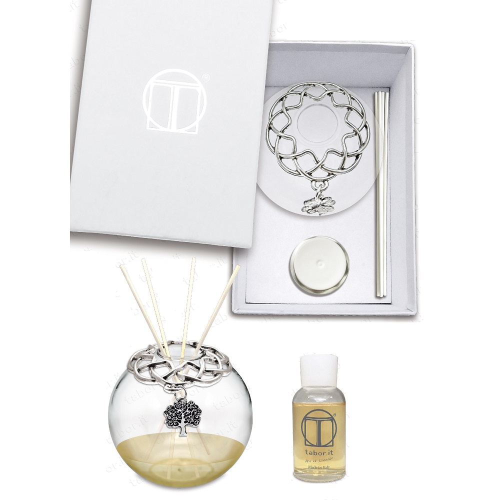 Profumatore sfera di vetro trasparente con decoro e ciondolo albero della vita in argento. Bastoncini e profumazione Ambra e Sandalo da 30 ml inclusi. Made in Italy